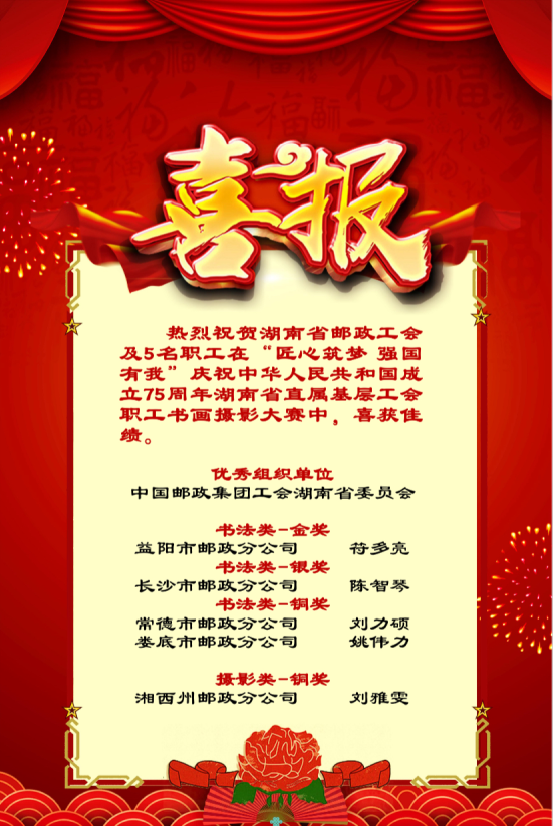 近日,在湖南省直工委会举办的“匠心筑梦 强国有我”庆祝中华人民共和国成立75周年职工书画摄影大赛中,中国邮政集团工会湖南省委员会喜获“优秀组织奖”;益阳市邮政分公司职工符多亮荣获书法类金奖;长沙市邮政分公司职工陈智琴荣获书法类银奖;常德市邮政分公司职工刘力硕、娄底市邮政分公司职工姚伟力荣获书法类铜奖; 湘西州邮政分公司职工刘雅雯获摄影类铜奖。