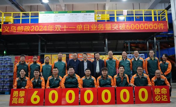 截至11月11日22:38,义乌市分公司单日业务量首次突破600万件,实现了高起点上的新跨越。浙江省省分公司副总经理李崇喜携省邮政工会副主席尤庆华专程到义乌四海处理中心现场祝贺,并看望慰问奋战在旺季生产一线的邮政员工,送上贴心、实用的慰问品,鼓舞士气,助力寄递业务快速发展。