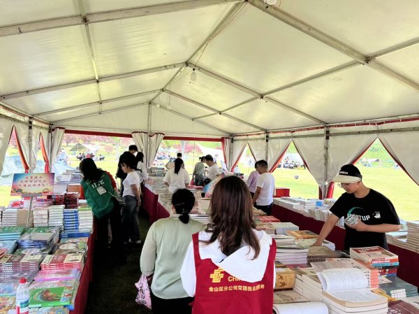 本次书展现场设置邮政图书展区,陈列图书品类涵盖启蒙教育、幼儿益智、工具书、作文日记、书法绘画、健康养生、国学经典、世界名著及社科读物等,种类达1200至1500种,满足不同年龄段读者需求。活动期间,所有图书免费向公众开放阅读,吸引众多职工驻足翻阅。同时为鼓励大家购书阅读,金山邮政推出“买2送5”“买3送8”等阶梯式优惠活动,以实惠价格让利读者。不少职工表示“既能低价购书,又能享受花海美景,体验感远超传统书店”。据统计,本次图书巡展实现图书销售 0.65 万元。