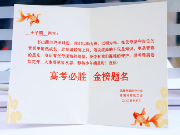 5月30日,恩施州邮政工会组织各县市邮政工会开展了一场温情满满的考前慰问活动,向全州即将踏上高考考场的43名邮政职工子女传递了组织的关怀与力量。