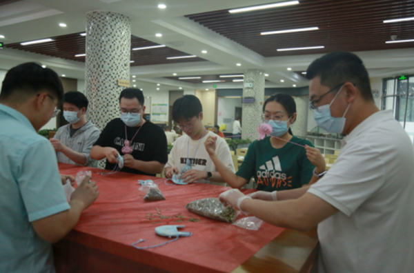 在香囊制作区的桌面上,工会工作人员讲解着“驱邪避疫”的端午习俗。大学生们小心翼翼地将各种香料装入香袋,草木气息唤起了乡愁,“我老家奶奶也做香囊,她总说艾草要晒透才够香。”“我家也是,每年端午门楣上都要挂菖蒲。”小小的香囊此刻已成了情感的纽带,一端系着故乡亲人,一端连着职场温度。
