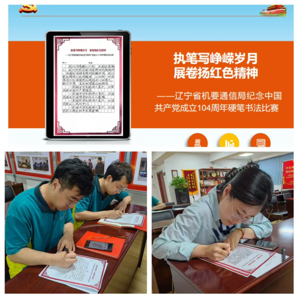 为庆祝中国共产党成立104周年,传承中华优秀传统文化,省通信局工会近期举办了“执笔写峥嵘岁月 展卷扬红色精神”——庆祝中国共产党成立104周年职工硬笔书法比赛。职工积极响应,以笔为媒、以墨传情,用书法作品向党的生日献礼。