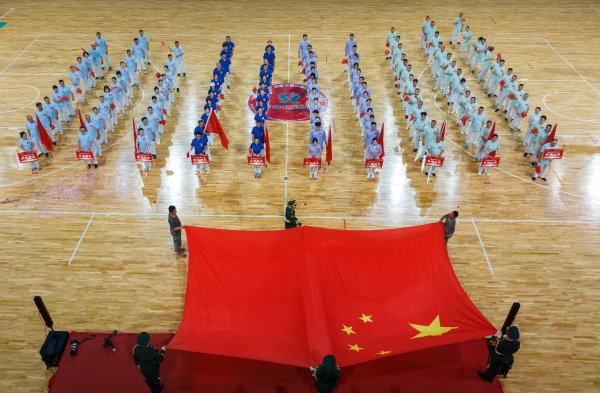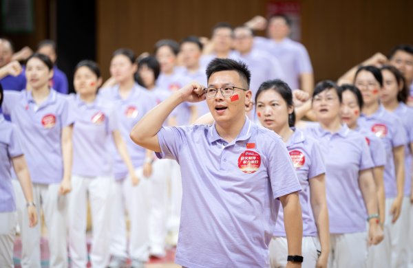庄严的国歌响起,大家注视着国旗,唱响国歌,心中涌动爱国的热情。国旗引领,旌旗飘扬。各战队旗手挥动手中的红旗,列队奔跑,摇旗呐喊,一面巨幅国旗越过方阵来到前场,将迎旗仪式推向了高潮。