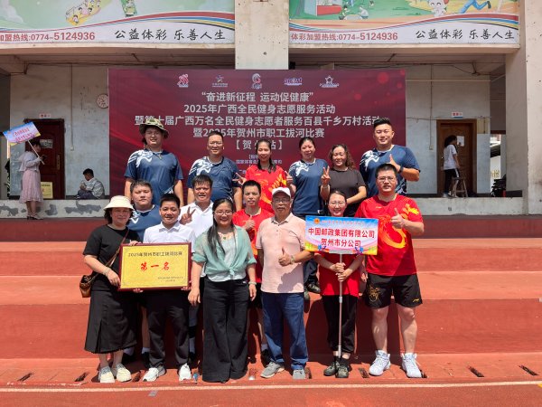 7月4日,在贺州市“奋进新征程、运动促健康”职工拔河比赛中,贺州市邮政分公司代表队力克强敌,勇夺冠军,以“一根绳、一条心、一股劲”的团队精神彰显邮政铁军风采。贺州邮政工会主席严秀霞亲临赛场,全程为运动员们加油鼓劲。