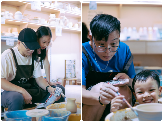 实操环节中,每组家庭领取专属陶艺工具包,开启“父子共创计划”:爸爸们卷起袖口当起“技术指导”,孩子们则挥洒天马行空的想象力——有的家庭制作“全家福”陶盘,用指纹印下每个人的笑脸;有的合力拉坯,将陶泥塑造成憨态可掬的小熊茶杯;还有小女孩偷偷在爸爸的陶杯底刻下“最棒爸爸”,准备送上惊喜。陶艺老师穿梭其间,耐心纠正手法、鼓励创新:“泥条要像搓面条一样均匀”“杯口捏出波浪边会更特别哦!”现场欢笑声不断:“爸爸,你的杯子歪啦!”“宝贝,我们给花瓶画彩虹吧!”泥土在指尖流转,爱意在协作中升温。
