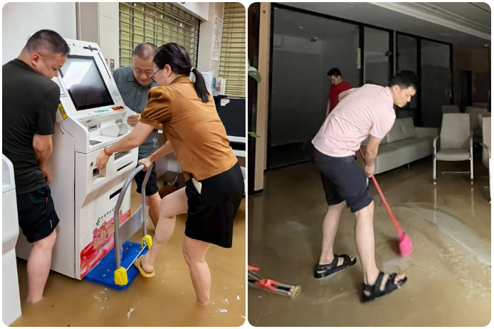 更严峻的是,因持续强降雨,樟木头、常平、黄江、凤岗、塘厦等5个镇区5日凌晨相继告急。面对来势汹汹的雨情,东莞邮政各级分会迅速启动防汛应急响应,13个金融网点暂停营业。相关单位及时转发预警信息,通知员工停工停业确保人身安全。受灾镇区领导提前部署灾后抢险,在安全前提下第一时间组织员工参与网点救灾,尽显“遇事不慌、从容应对”的风貌:凤岗总经理丁耀永带头赶赴现场,组织抢险恢复,同步转移重要凭证、票据及电子设备,避免二次受损;检修电路网络、清洁消毒营业场所、采购沙袋加固出入口,同时告知客户临时停业情况,引导通过电子渠道办理业务,最大限度降低影响。