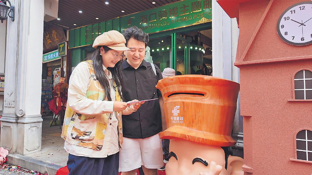 海口骑楼老街是首批“中国历史文化名街”。骑楼主题邮局位于老街中心位置,邮局一楼设有打卡盖戳区、文创产品区、集邮品区、政务图书区、海南特产区和邮福咖啡吧,展架上摆满了骑楼灯笼冰箱贴和骑楼主题邮局纪念封、主题邮册等集邮文创产品;二楼陈列着邮政老照片、珍贵邮票,复原的老邮政办公区成为热门打卡点位。图为一对来自甘肃的新婚夫妇在骑楼主题邮局邮寄纪念封,留下一份蜜月度假的美好记忆。