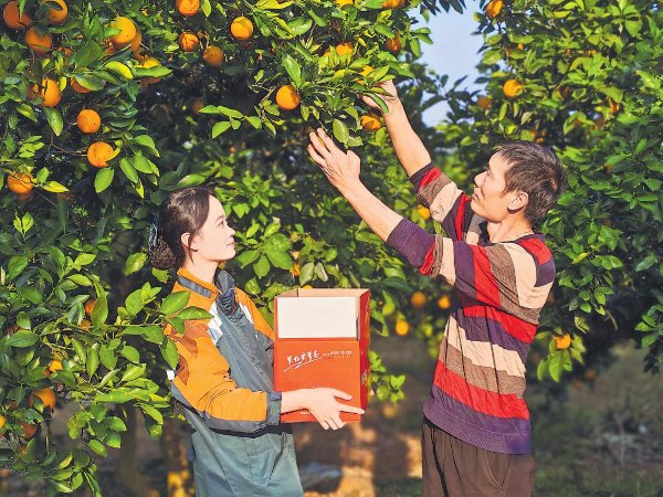邮政员工化身“橙”意助手,与果农并肩采摘,一箱箱冰糖橙瞬间变成“金果果”。