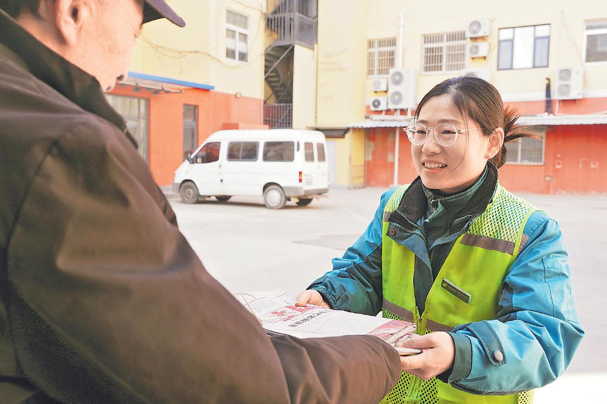 冯翠翠把报纸投递到单位值班人员手中。