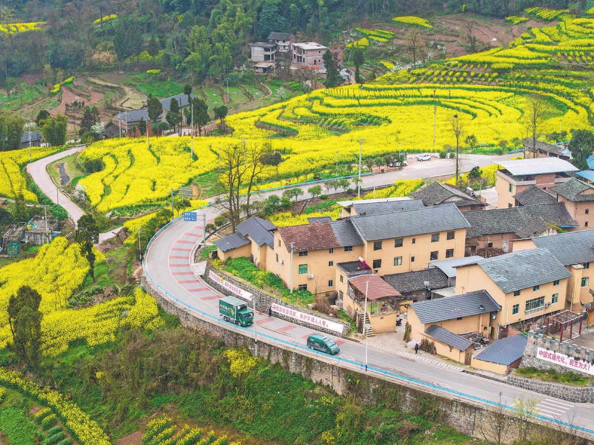 3月13日,巴渝梯田铺金浪,邮车穿行其间,将春耕物资送往武隆区庙垭乡,为农户稳产增收注入邮政力量。 □王金庄 摄