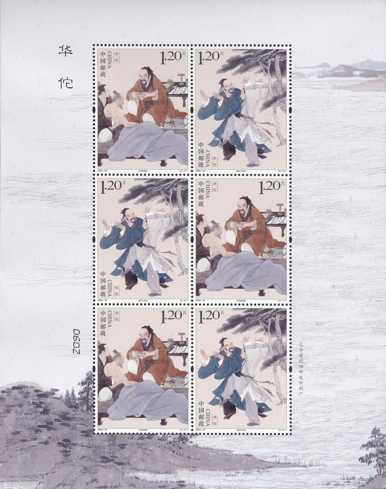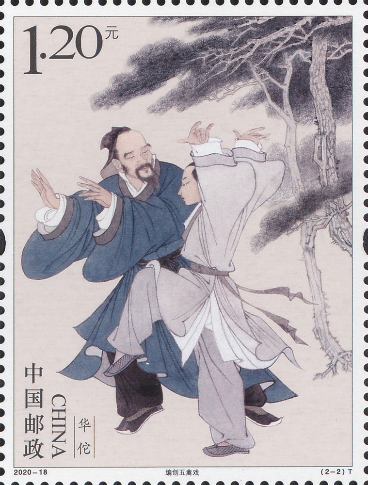 中国邮政定于2020年8月19日发行《华佗》特种邮票一套2枚,小型张1枚。邮票图案名称为:发明麻沸散、编创五禽戏,小型张图案名称:华佗像。全套邮票面值为8.40元。计划发行数量分别为:套票780万套,版式二95万版,小型张630万枚。