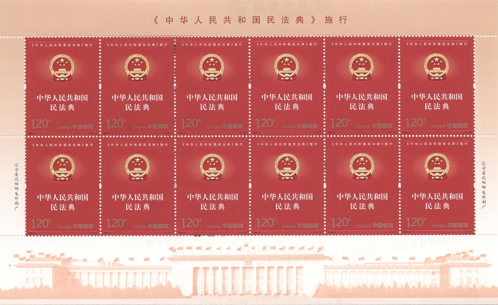 中国邮政定于2021年1月1日发行《<中华人民共和国民法典>施行》纪念邮票1套1枚。详情如下: