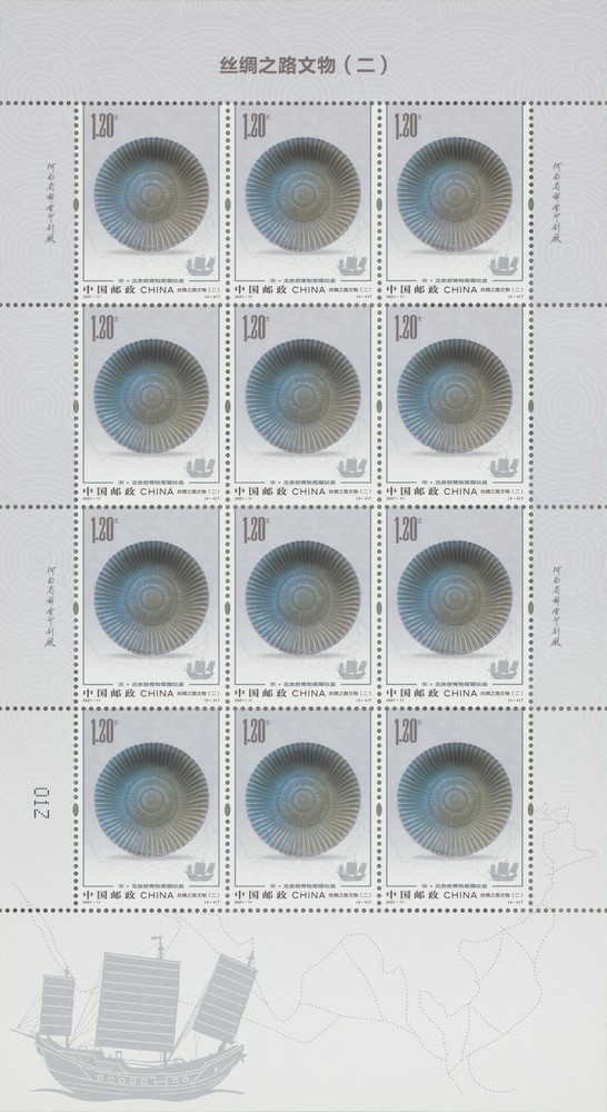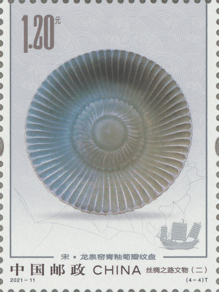 为了弘扬“丝路精神”,中国邮政定于2021年6月12日发行《丝绸之路文物(二)》特种邮票一套4枚,邮票图案内容分别为汉·凸瓣纹银盒、唐·长沙窑青釉褐斑模印贴花椰枣纹执壶、五代十国·波斯孔雀蓝釉陶瓶、宋·龙泉窑青釉菊瓣纹盘。全套邮票面值为4.80元,邮票计划发行数量735万套。
