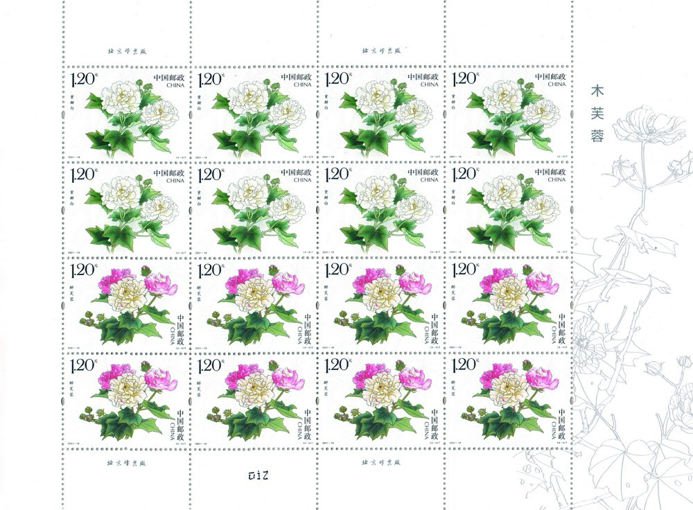 中国邮政定于2021年9月7日发行《木芙蓉》特种邮票1套4枚。详情如下: